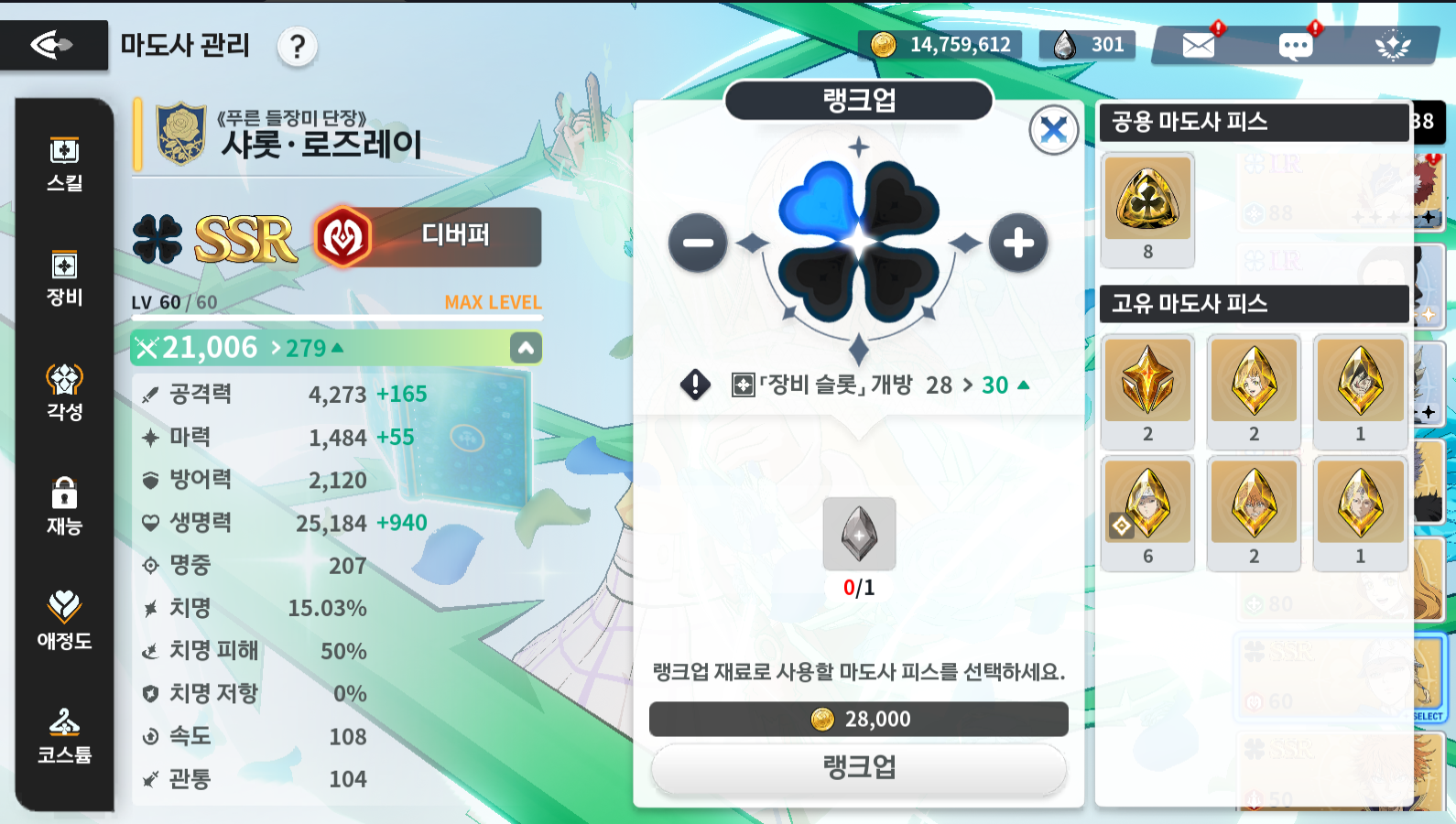 ※ 랭크업 시 주의할 점은 꼭 공용 마도사 피스를 사용하시길 바랍니다. 애정도를 올리면 고유마도사 피스와 공용마도사 피스를 주는데 진급 및 각성 시에 무조건 고유마도사 피스로 진급 및 각성을 할 수가 있기에 랭크업 때 사용하게 되면 진급을 못할 수도 있습니다!