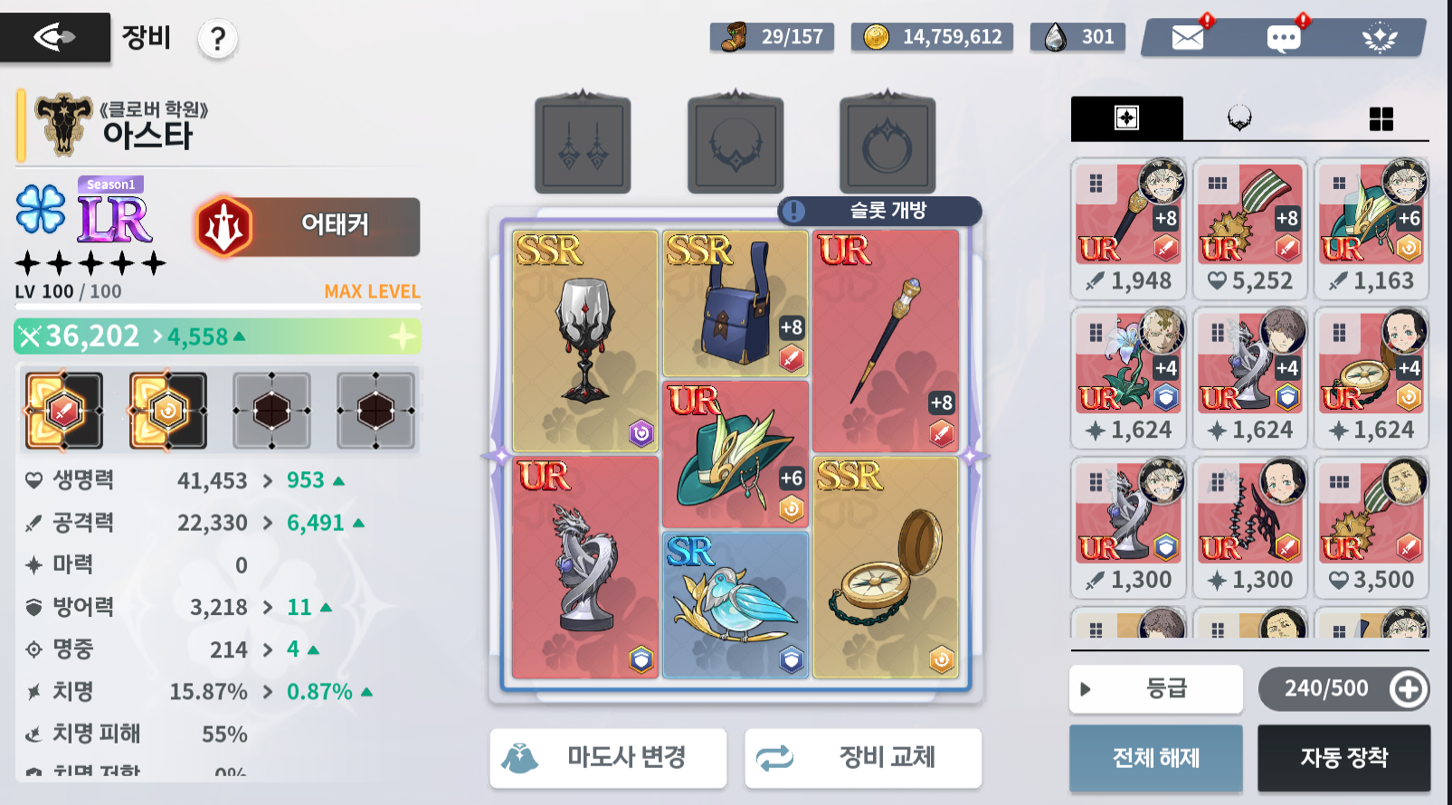 아직 근성던전 10단계 자동사냥만 가능해서 UR장비가 최고이지만 UR이라도 있으니 그나마 편해진 것 같습니다. 장비세팅은 세트를 맞추기보다는 각 직업에 맞게 어테커는 공격 및 마력, 디펜더는 방어 및 생명 등 능력치 위주로 세팅해 주는 것이 좋습니다.