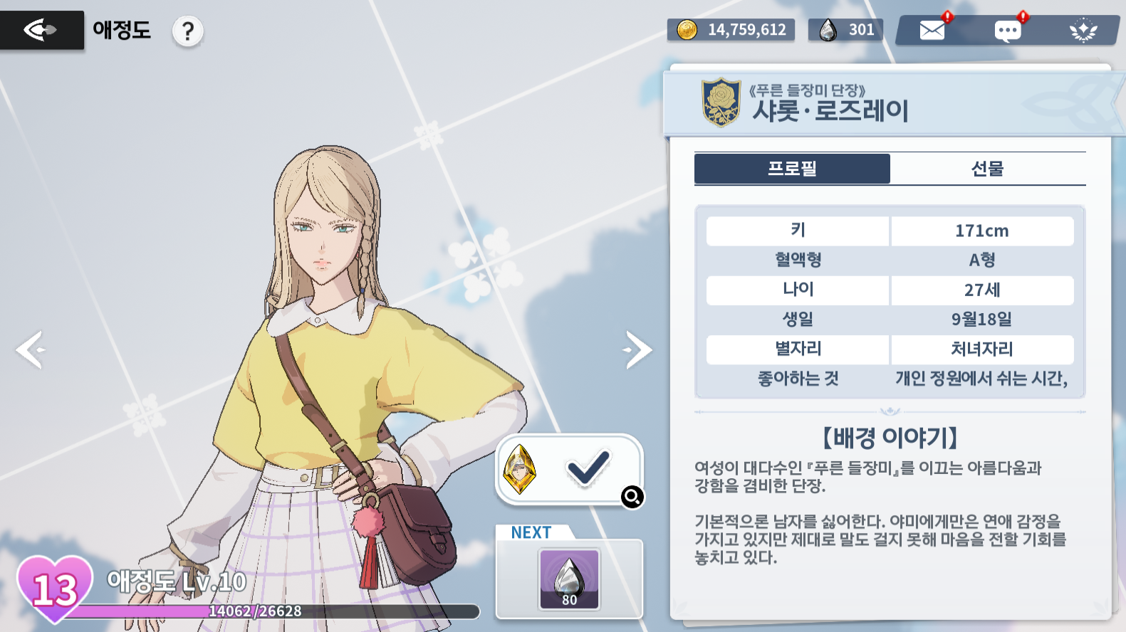 애정도 레벨은 15까지 있으며, 마도사피스 및 블랙크리스털, 코스튬 등 다양한 보상을 받을 수 있기 때문에 무조건 올려줘야 합니다. 애정도는 일반도전 순찰스테이지를 통하여 올릴 수 있고, 선물을 통해서 편하게 올릴 수도 있습니다.